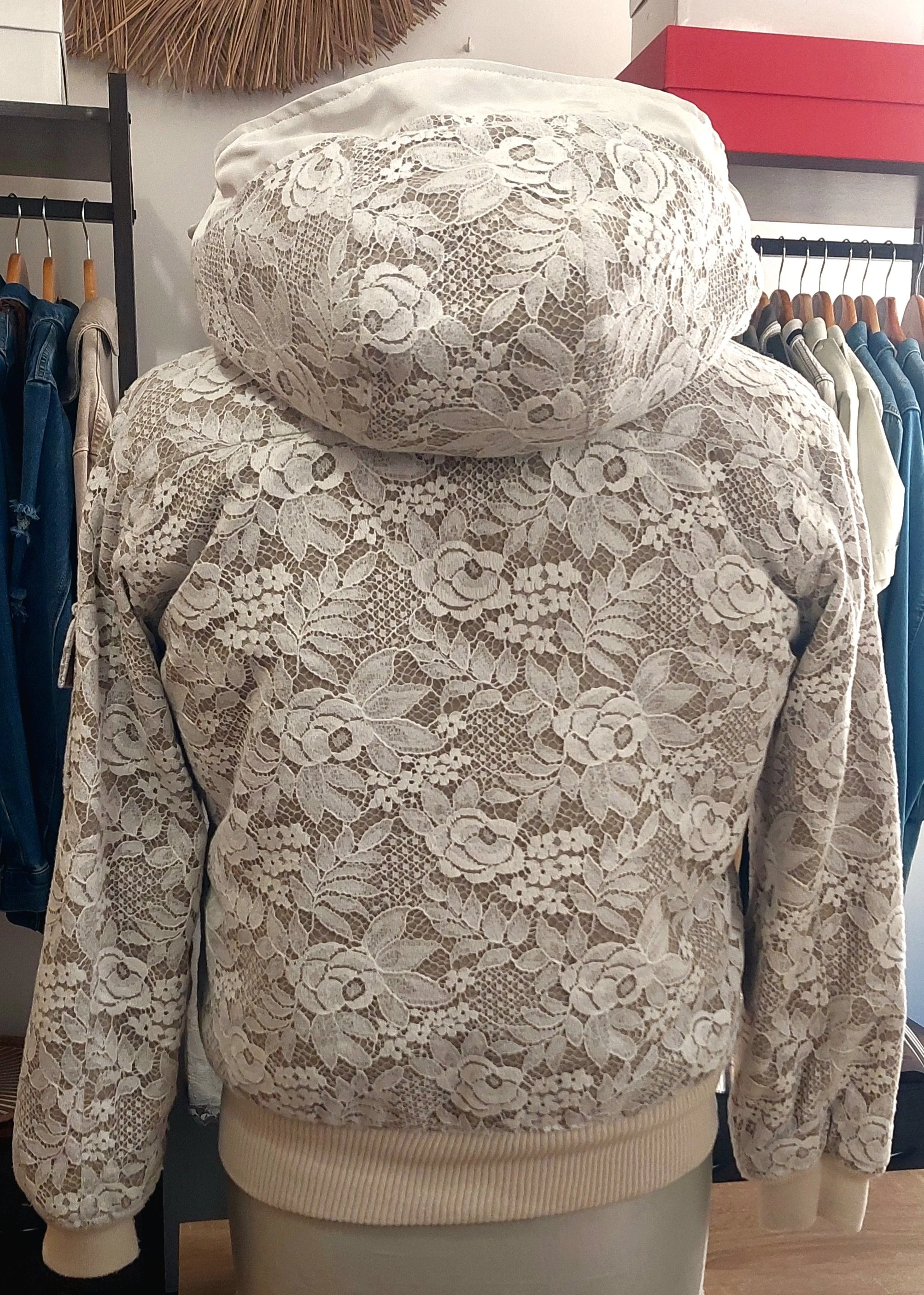 Blouson taille M, mixte. En coton beige recouvert de dentelle de Calais. Intérieur fourrure blanche. Extrémités côte de maille. Large capuche, fermeture éclaire.
